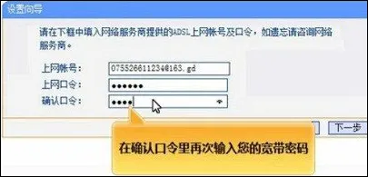 三.接下来是填写ADSL上网宽带账号,这步非常重要,如果填写错误,将会导致无法上网。这个上网账号和密码是网络商提供给您,如果忘记,请打网络商客服电话咨询获取,输入账号和密码后,依旧是点击底部的“下一步”如下图所示。