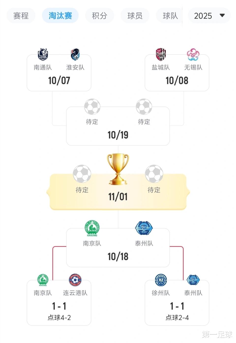 昨晚,排名第三的徐州队主场对阵排名第六的泰州队,比赛结果和第一场1/4决赛何其相似,徐州队率先进球,随后被泰州队1比1扳平,两队同样进入了点球大战,甚至连点球比分都一样,也是4比2,总比分5比3,但这次获胜的是泰州队。