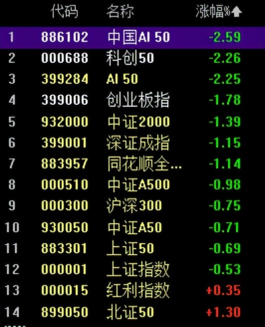 上午科技三杰领跌,全市场4220股下跌,下午要注意,一旦创业板跌幅破2%,那么全市场就会看到5000股绿盘。