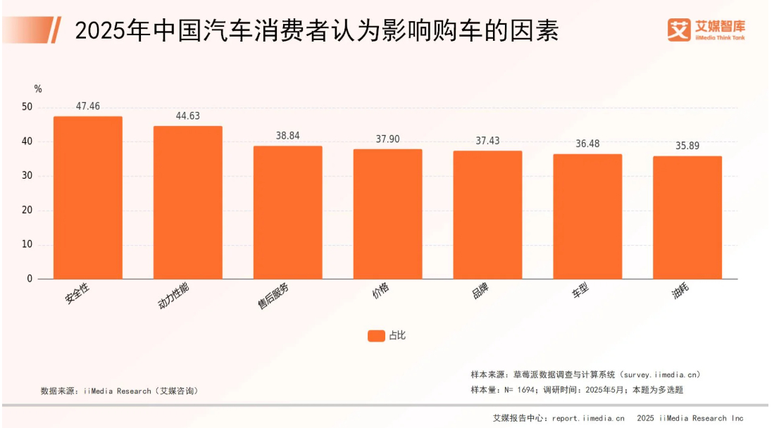 安全性能与动力性能是用户的首要需求。据调研机构艾媒咨询数据,2025年中国汽车消费者购车的影响因素中,47.46%的安全性和44.63%的动力性能排在第一、二位。