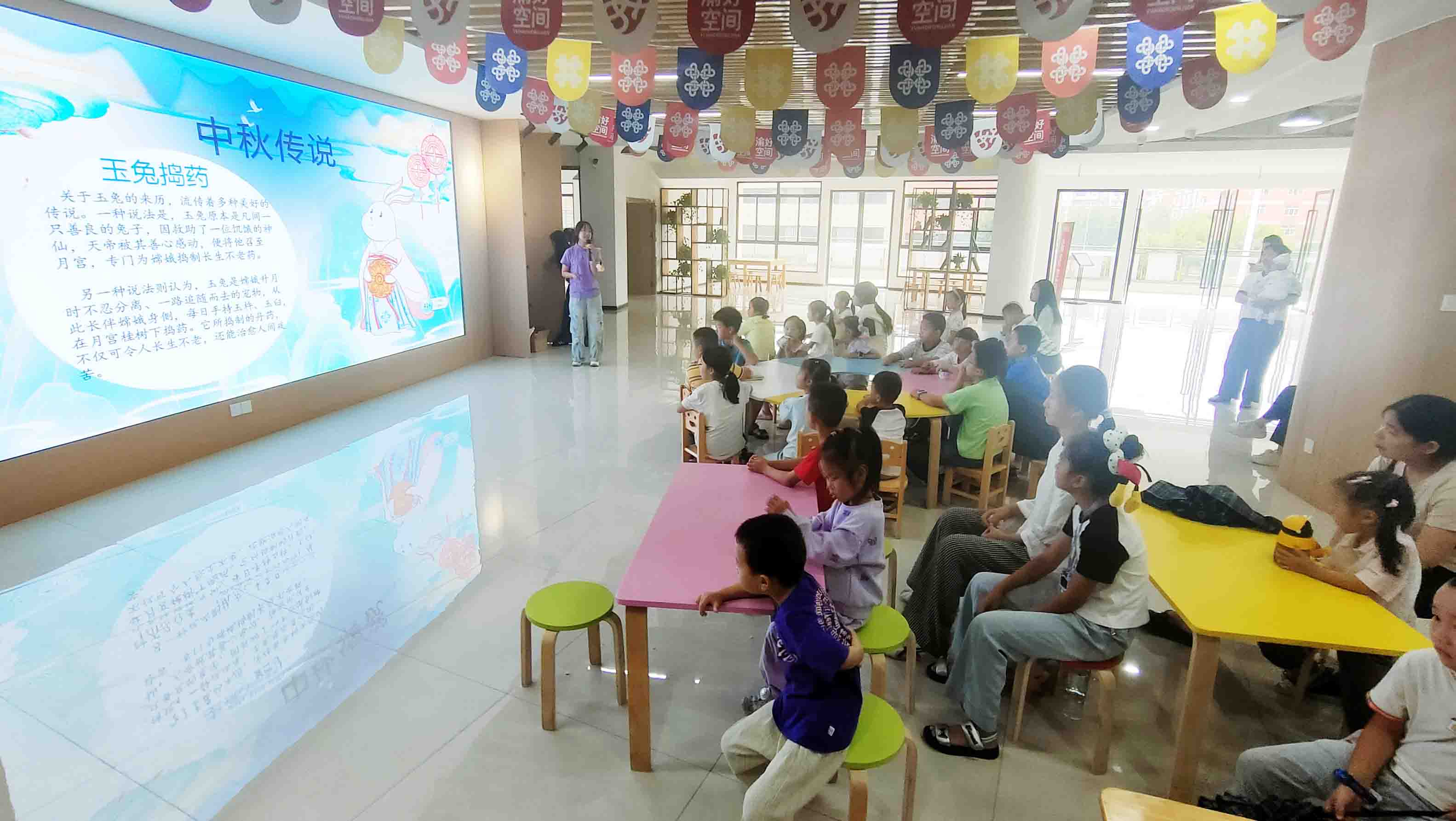 活动伊始,志愿者们通过生动形象的图片和文字,详细介绍了中秋的起源、习俗与传说,同时播放了如嫦娥奔月、玉兔捣药等中秋相关动画视频,极大地增强了青少年对传统节日的认同感与兴趣。