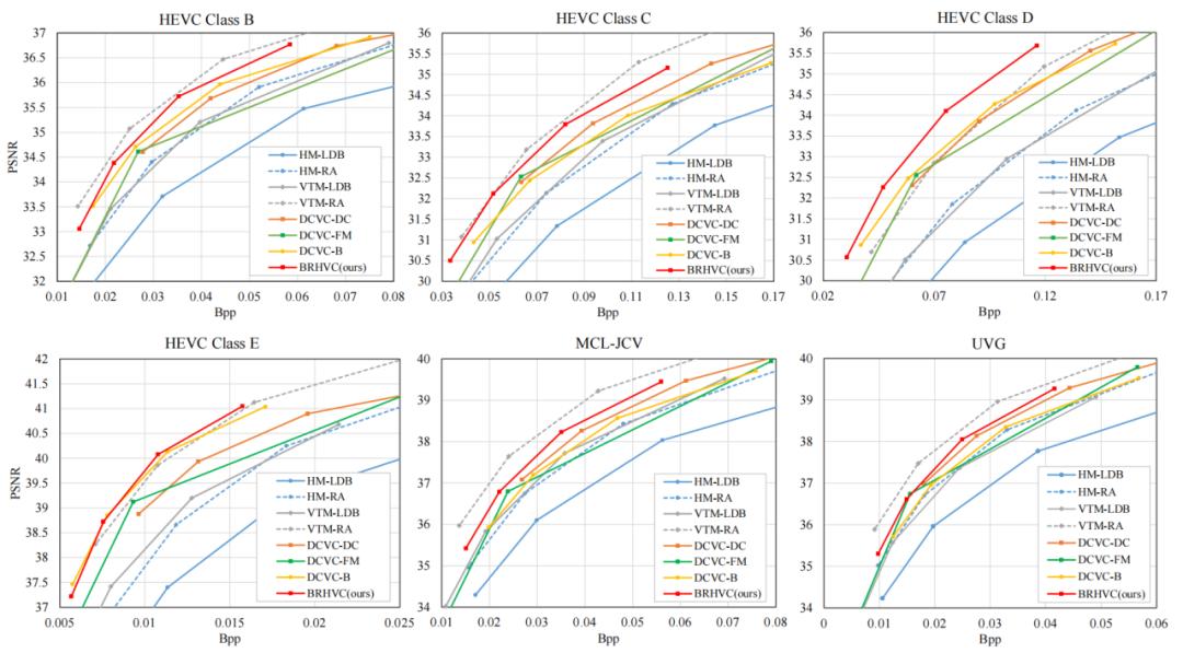 结果表明,在 HEVC 数据集上,BRHVC 相比于传统编码器 VTM-LDB 平均实现 32.0% 的码率节省,其中在 Class D 序列上增益高达 44.7%;同时,BRHVC 相比于传统编码器 VTM-RA 实现 1.1% 的码率节省,在编码效率上成功超越 VTM-RA。
