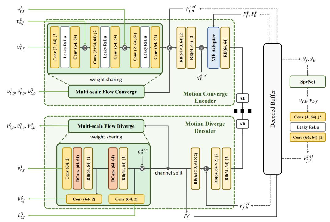 BMC 模块针对长跨度运动估计难题,将光流网络生成的多尺度光流(原始、1/2 分辨率、1/4 分辨率)收敛至单一隐变量进行联合压缩,并引入双向参考帧间的互运动特征作为先验,动态适配不同帧类型的信息需求。这种设计突破过往光流压缩的局限,使网络在解码端能重构出覆盖更大感受野的准确运动场,显著提升大位移场景下的运动补偿精度。