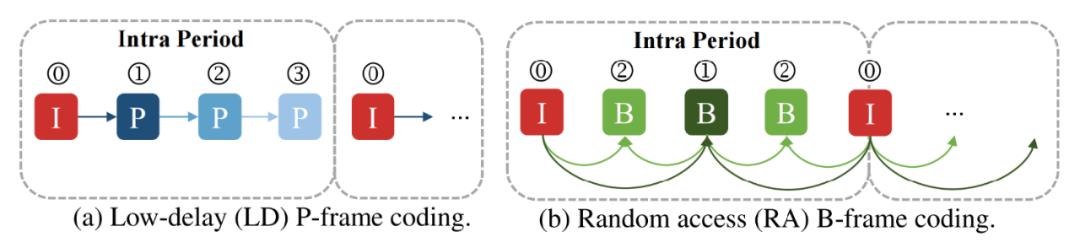 背景: 从低时延模式到双向模式的扩展视频编码中的低时延模式(Low Delay, LD)采用单向 P 帧编码,仅参考前一帧进行前向预测编码。该方法延迟较小,更适用于直播场景,可以满足实时交互需求,但压缩效率偏低。双向模式(Random Access, RA)采用双向分层 B 帧编码,每个 B 帧可同时参考前后两帧,利用时域上的双向信息,在相同画质下可比低延迟模式节省 20+% 码率,是点播、存储等高画质场景首选。