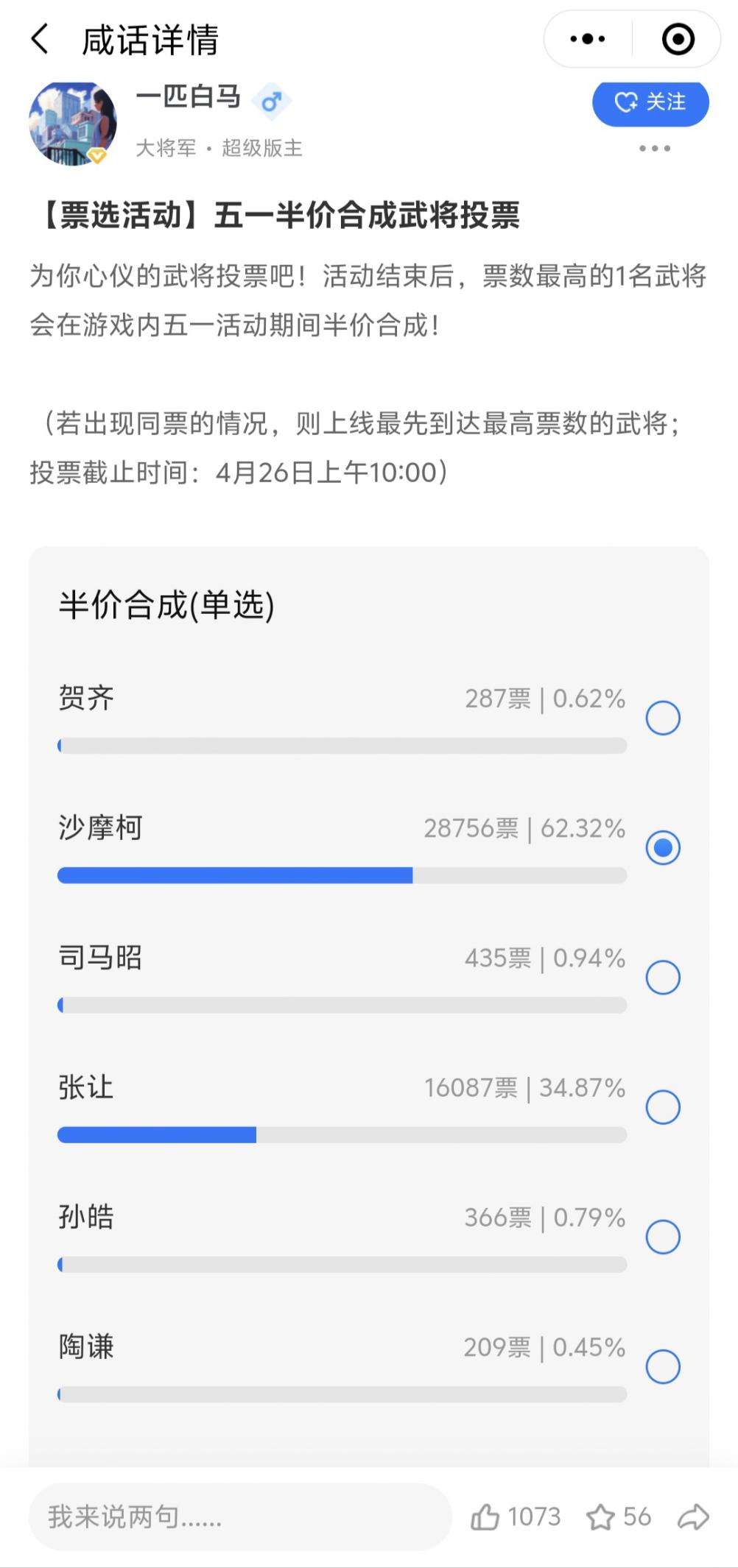 票数最高的1名武将会在游戏内五一活动期间半价合成。