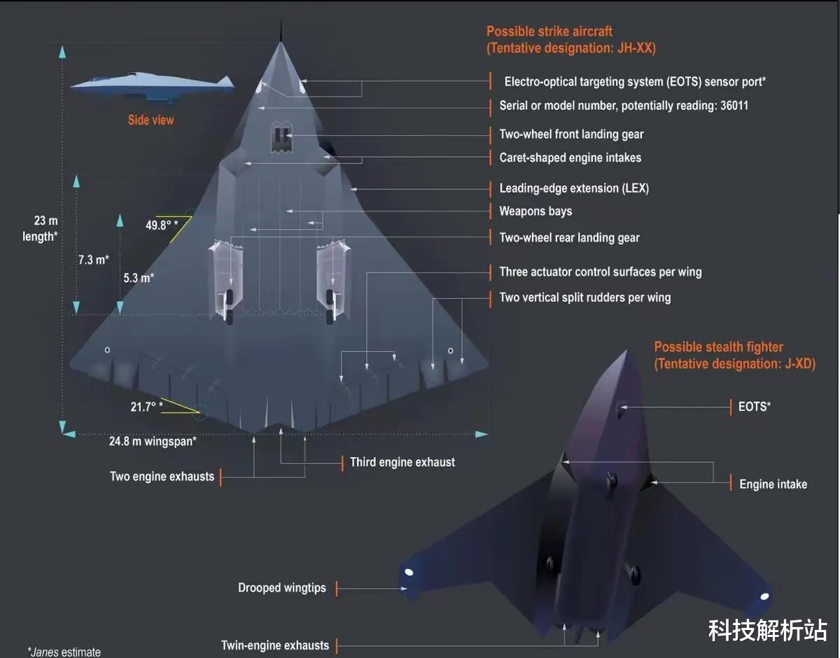 英国媒体分析认为,歼36机长约23米,翼展约24.8米,主弹仓长达7.3米,副弹仓也长达5.3米,最大起飞重量超过55吨,作战半径超过3000公里。