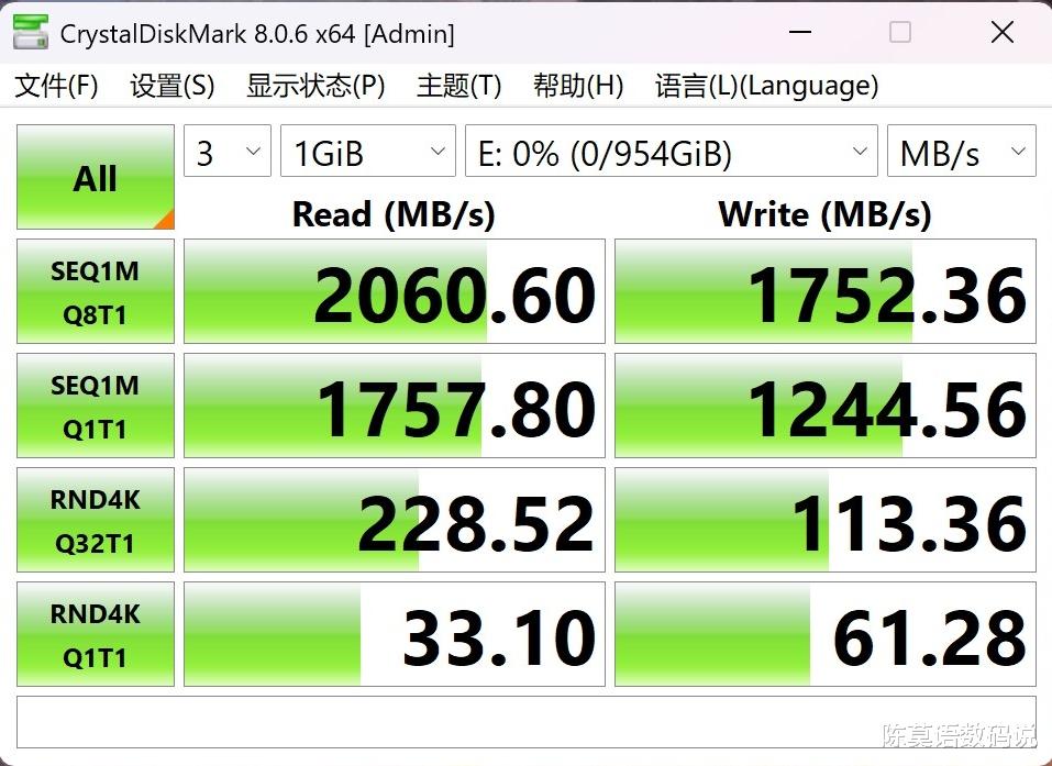 通过经典的Crystal Disk Mark软件对腾隐P2000进行数据读写测试,实测读取速度可达2060MB/s,写入速度可达1752MB/s,这高速读写性能已经不输电脑自身的固态硬盘了。