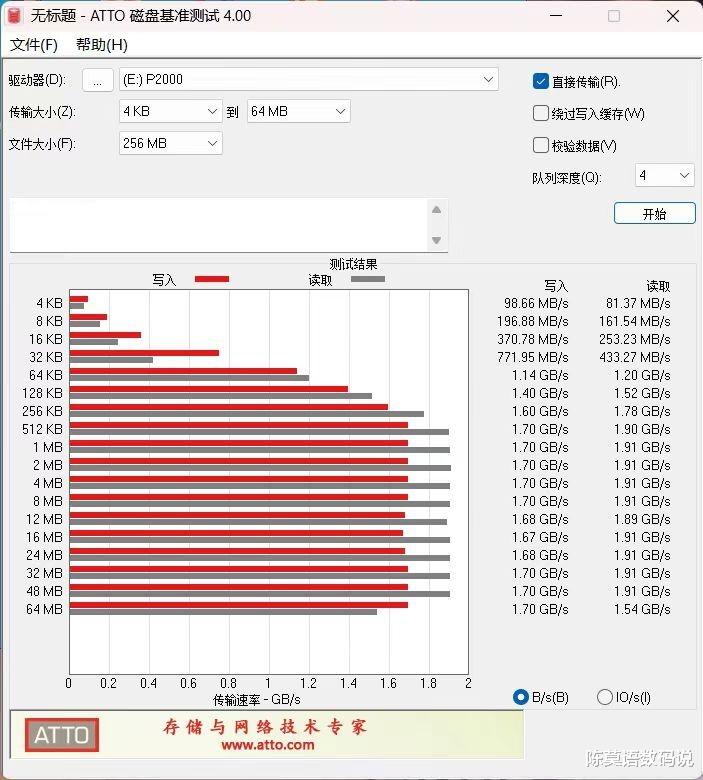 ATTO磁盘基准测试,依据柱状图可以看到当传输数据小于32KB时测试硬盘读写速度小于1GB/s。当传输文件大于512KB时,硬盘均能稳定在写入速度1.7GB/s、读取速度1.9GB/s的水平,可见腾隐P2000在高速读写存储上具有较好的稳定性,并且即使传输小文件的速度也是硬盘里很优秀的水平。