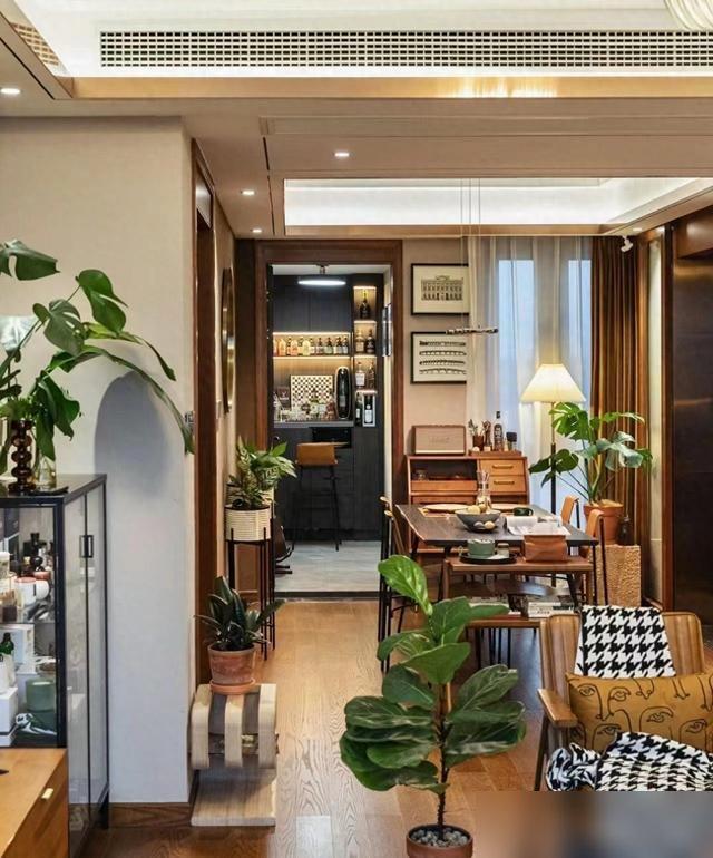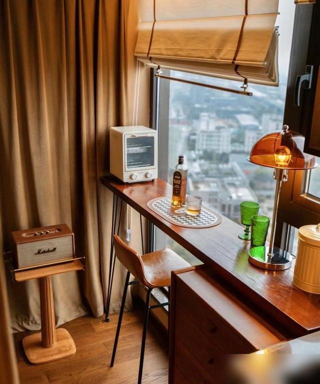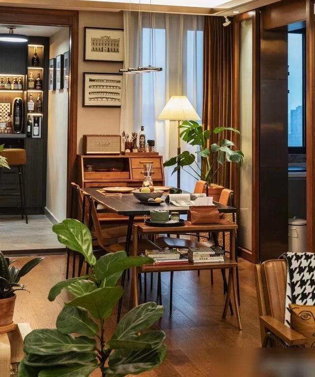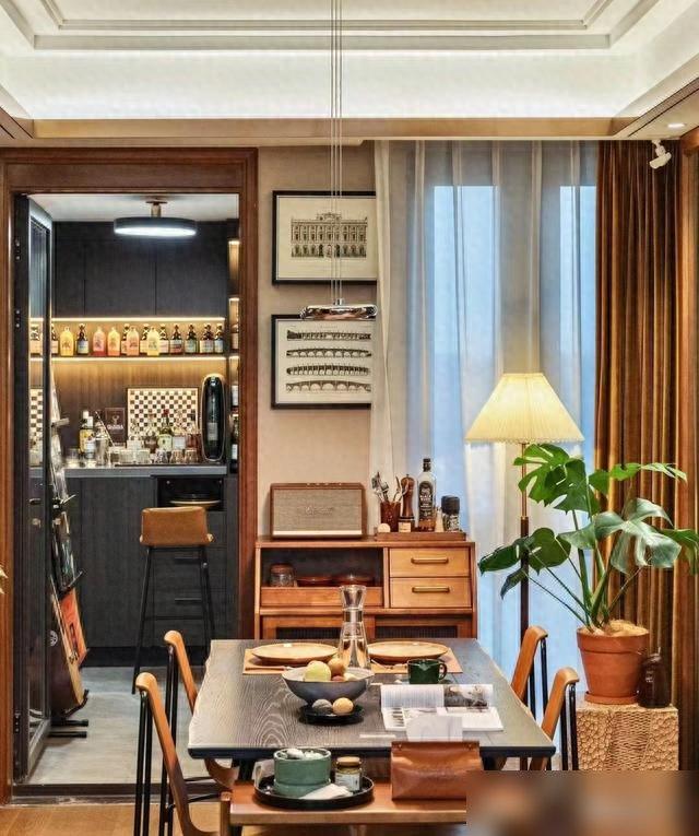 很多人怕 “满 ”会乱,但这对夫妻的“满 ”是 “有秩序的热闹 ”:书房里书堆得半人高,却按作者名字排得整整齐齐;餐边柜上摆着陶瓷罐、玻璃瓶,装着花生蜜饯都是老伴儿从菜市场挑来晒干 的;连阳台都没浪费 ——不晾衣服改小酒吧台,拉上窗帘就是独立空间,坐高脚椅能看见窗外梧桐树,风一吹叶子沙沙响,比去网红店拍 “氛围感照片 ”舒服一百倍 ——毕竟窗外那棵树,可是他们看了二十年 的 “老邻居 ”啊!