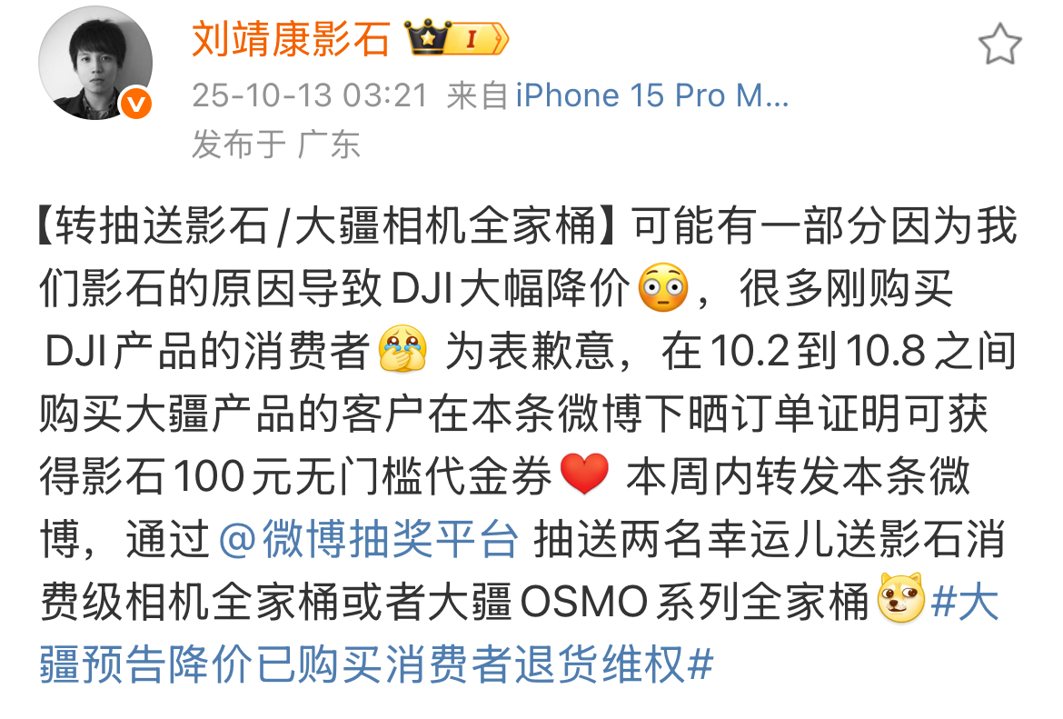 10月13日,影石创新CEO刘靖康在微博上发布了一则别具深意的致歉声明,称“可能有一部分因为我们影石的原因导致DJI大幅降价”,并为10月2日至10月8日期间购买大疆产品的消费者提供100元无门槛代金券。