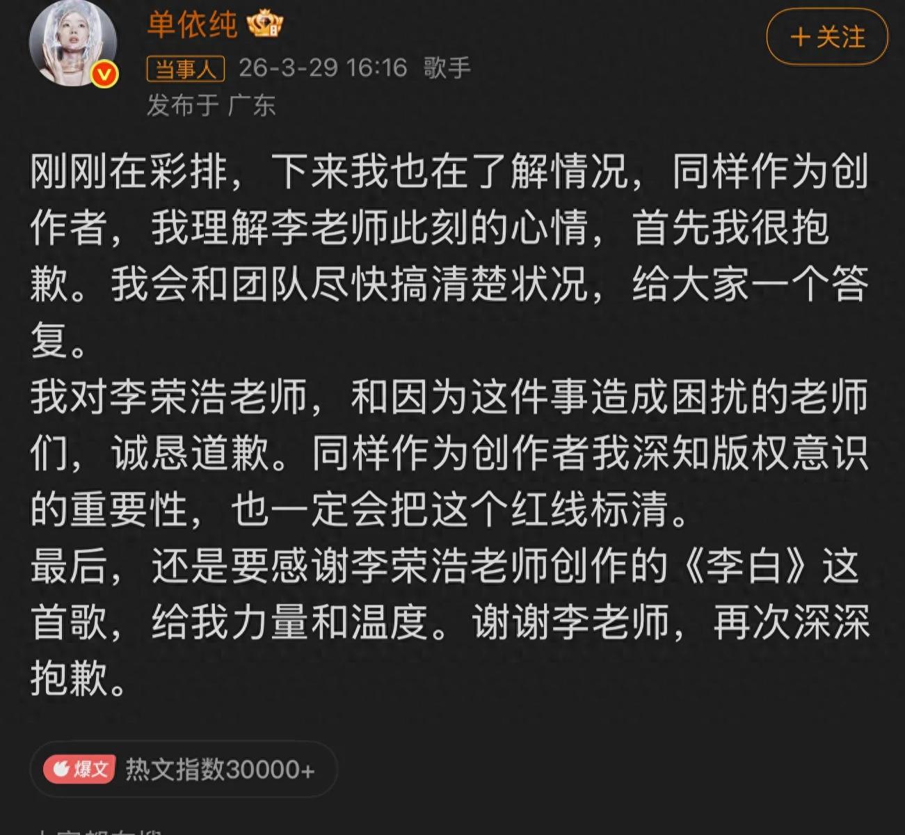 单依纯方面发布声明,侵权责任因为“沟通误会”和“团队疏忽”,对李荣浩郑重道歉。