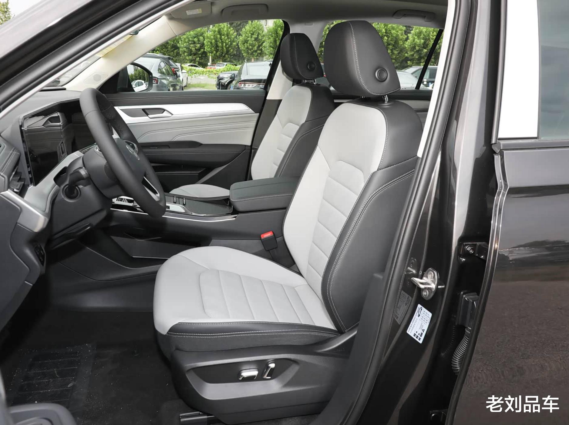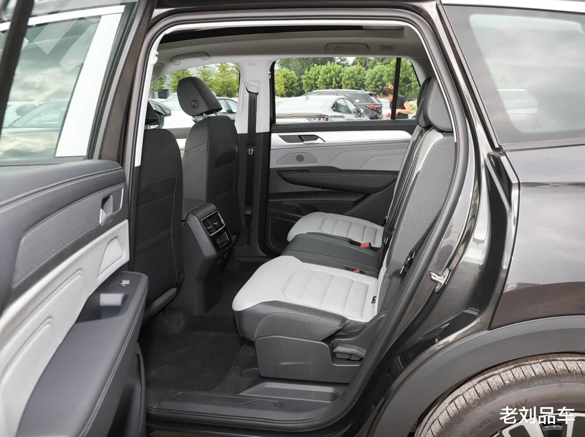 前排座椅都是仿皮材质,坐上去支撑性很好,比途岳的座椅稍微软一些,版本之间功能上差异比较大。330TSI版主驾驶只有电动调节(带4向高低),副驾驶则是手动调节。380TSI四驱R-Line系列主副驾都是电动调节,并且带有前排通风,加热反而成了选装项。特色配置方面,有30色可调的氛围灯,前排手机无线充电除了入门版都有,但是只有15W。高配车型(380TSI系列)可以升级后排隐私玻璃和前后排的夹层隔音玻璃,对隔绝风噪、胎噪有一定的帮助。