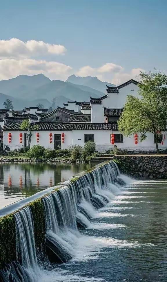 黛瓦白墙临水立,红灯串串添红。瀑流层叠韵淙淙。远山如墨染,古意韵无穷。