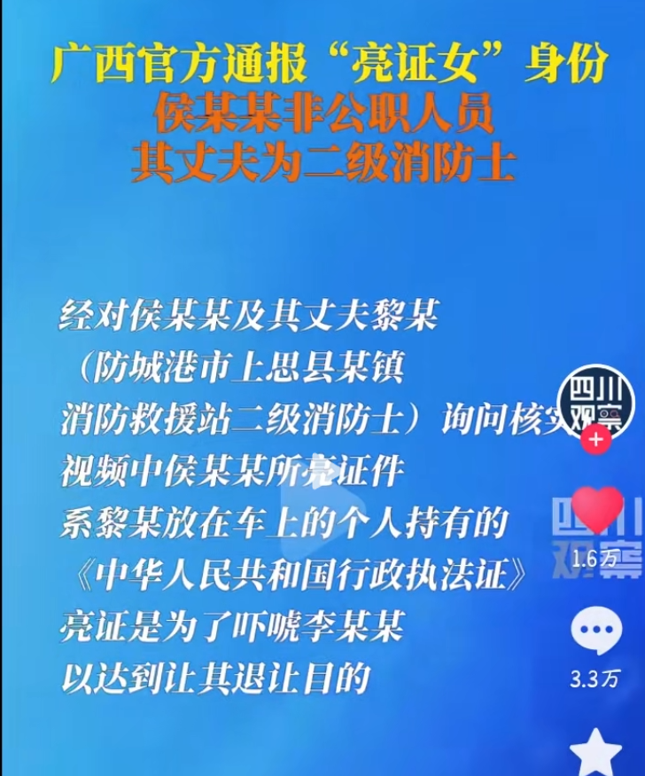 不好意思哈,昨天说错了,证不是假的,是真的,但是是她老公的行政执法证,她老公是消防站的,证件放车里被她误用了,你品细品这个解释看起来比上一个稍微合理了那么一点点,但仔细一扒,更魔幻了: