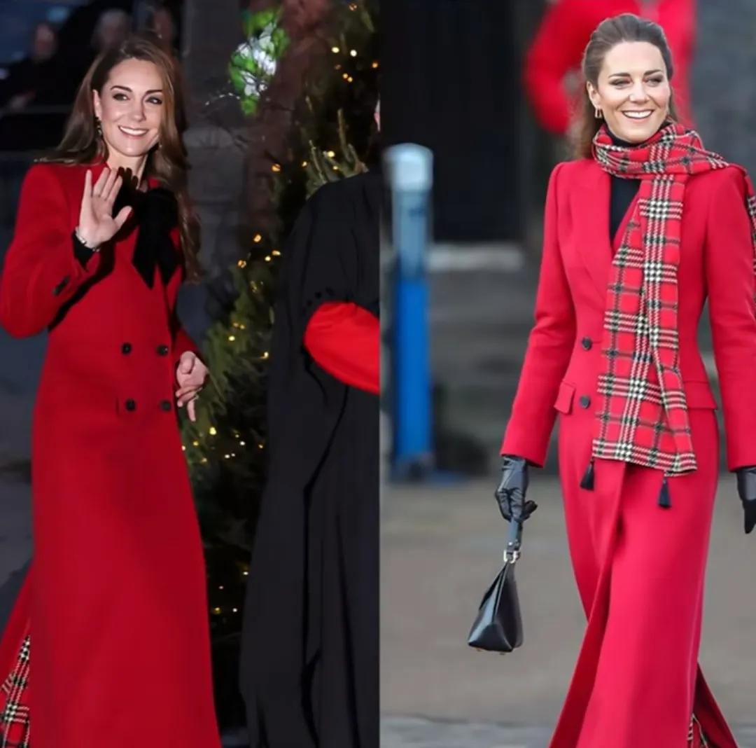 凯特王妃还喜欢“旧衣新穿”,此前凯特在2024年12月6日主持的圣诞颂歌音乐会,身穿的麦昆双排扣红色大衣,就是以前的旧衣。
