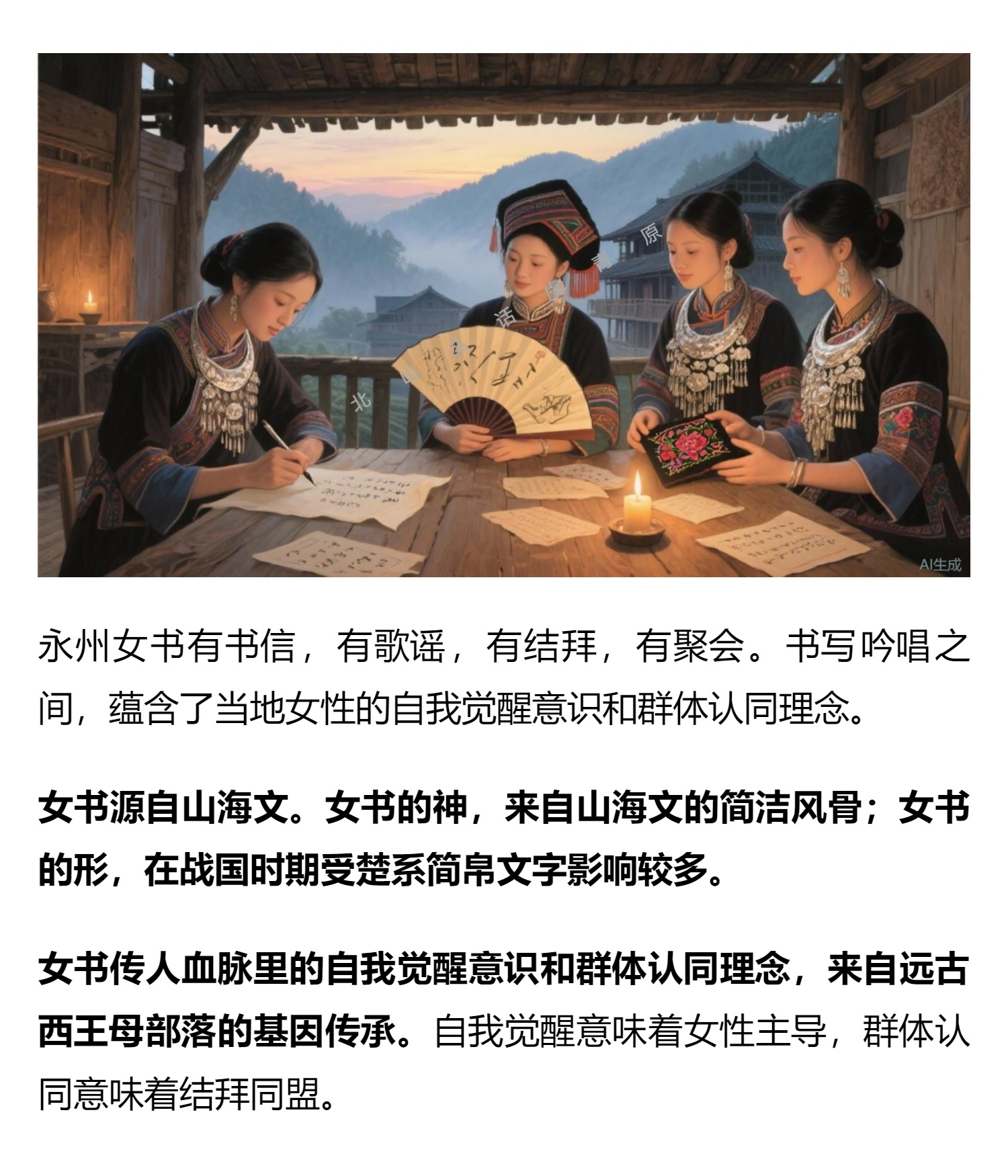 女书源自山海文。女书的神,来自山海文的简洁风骨;女书的形,在战国时期受楚系简帛文字影响较多。女书传人血脉里的自我觉醒意识和群体认同理念,来自远古西王母部落的基因传承。自我觉醒意味着女性主导,群体认同意味着结拜同盟。