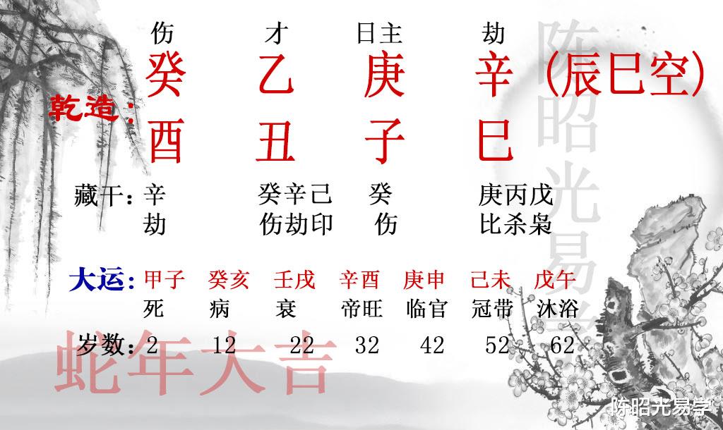 乾造:癸酉,乙丑,庚子,辛巳(辰巳空)