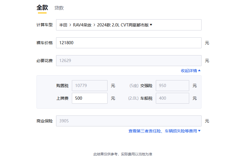 RAV4荣放在动力方面提供2.0L+CVT无级变速(模拟10挡)和2.5L+E-CVT无级变速箱两种动力系统,最大输出功率有126kW和160kW之分。对于大部分家庭用户来说,2.0L车型就足够使用了,2.5L油电混合版车型虽然经济性更好,但20万级的售价又超出了主流用户的预算。RAV4荣放2024款2.0L CVT两驱都市版是该系列的入门版车型,终端优惠4.8万元后,裸车价来到12.18万元,上牌保险全款落地价为13.9万元左右。如果贷款的话,价格会在这基础上略涨一些,此处不做讨论。