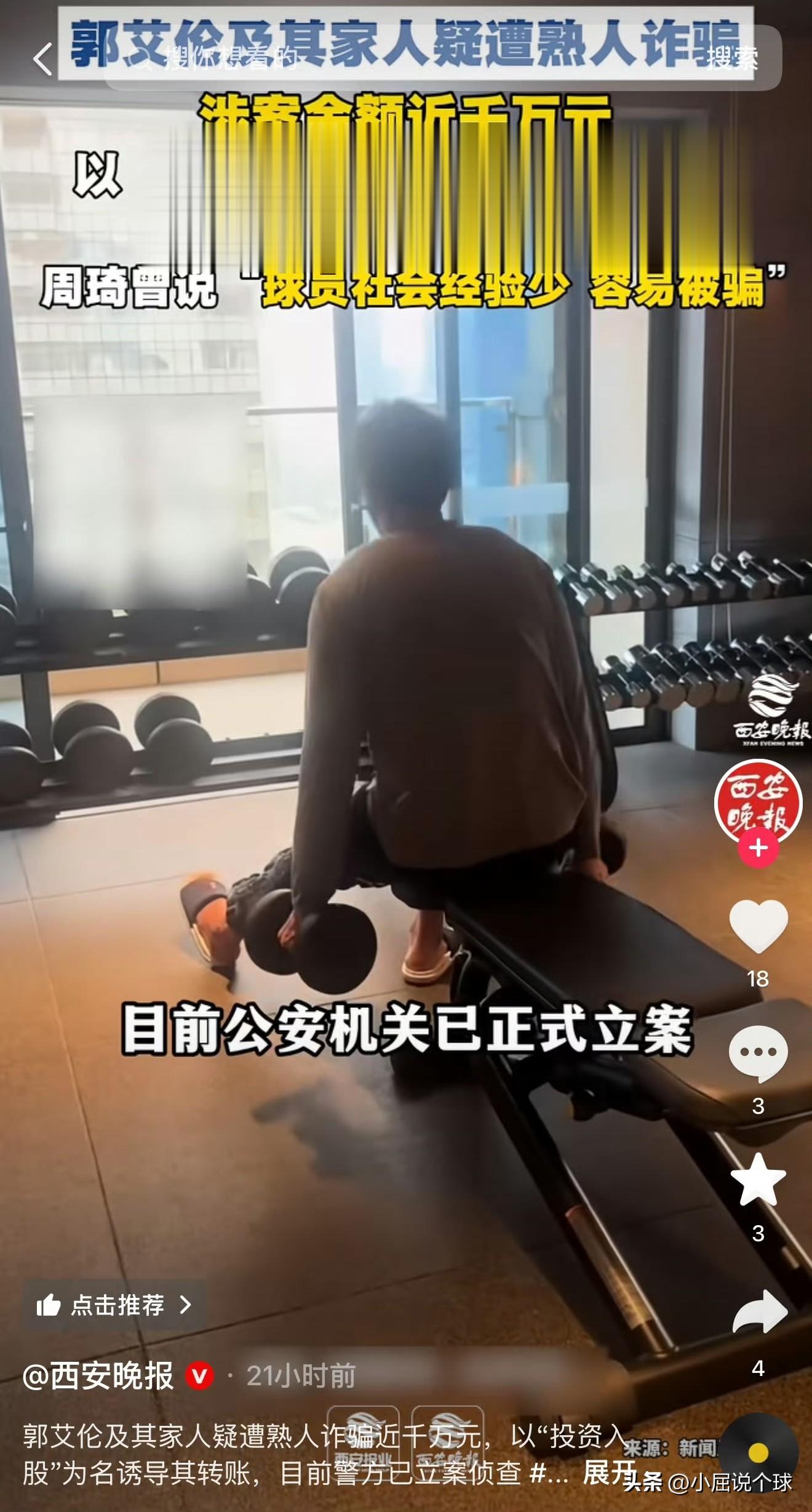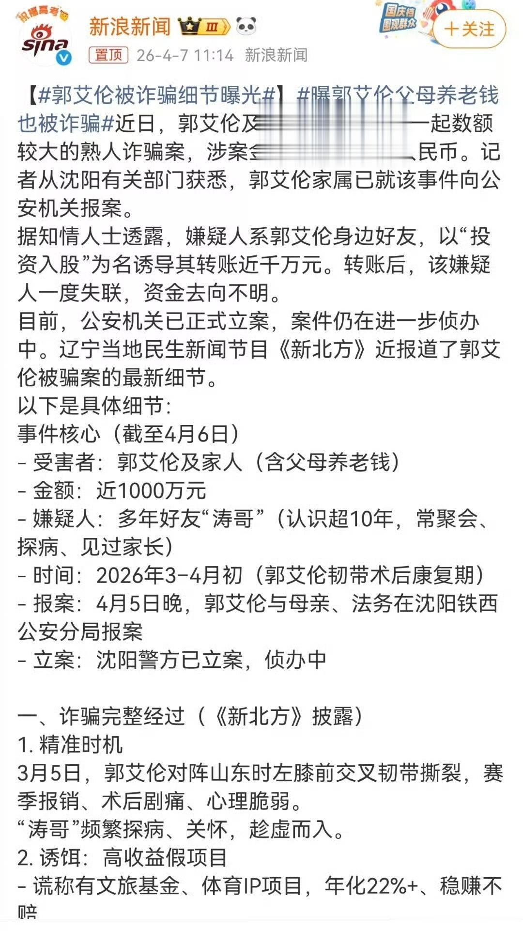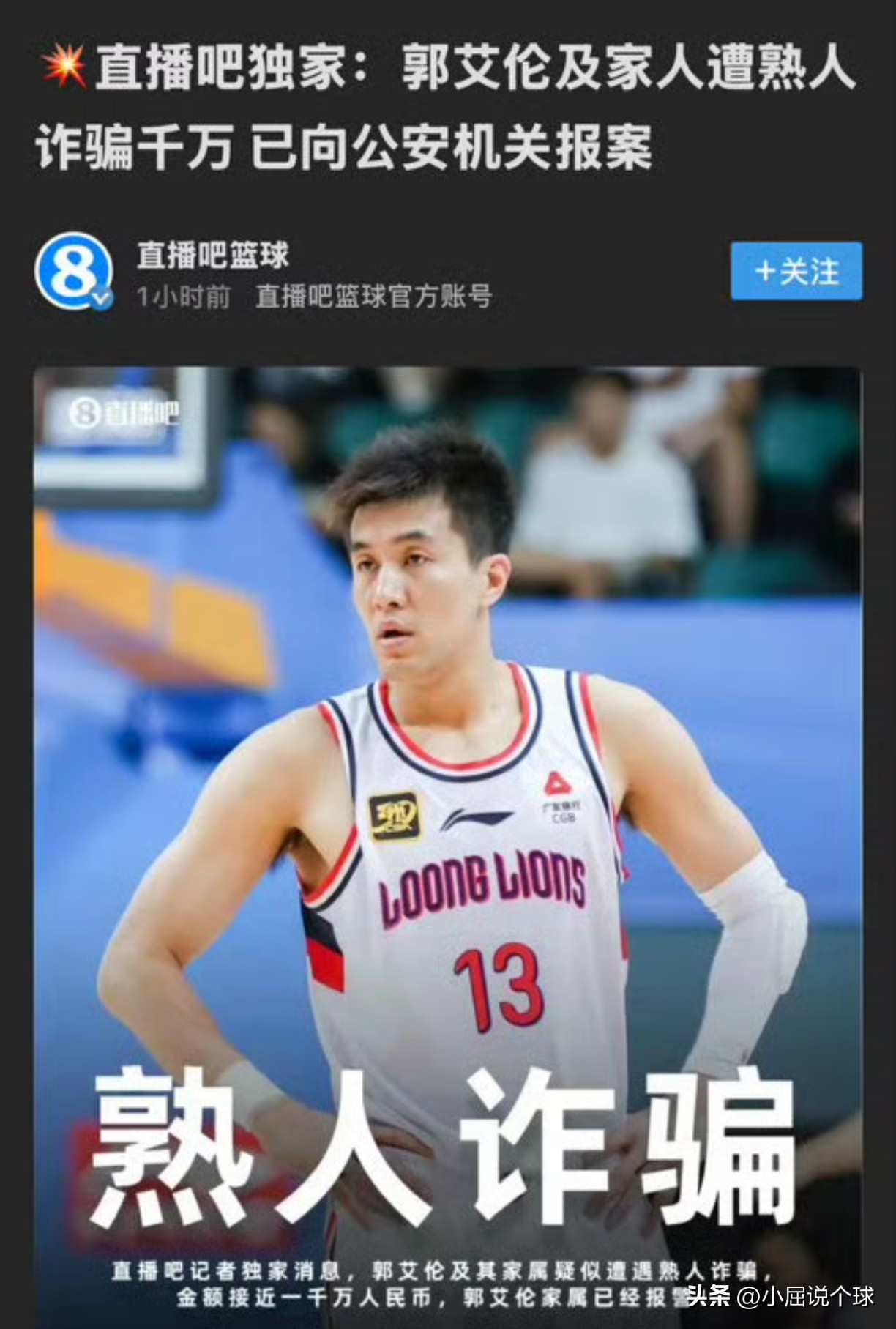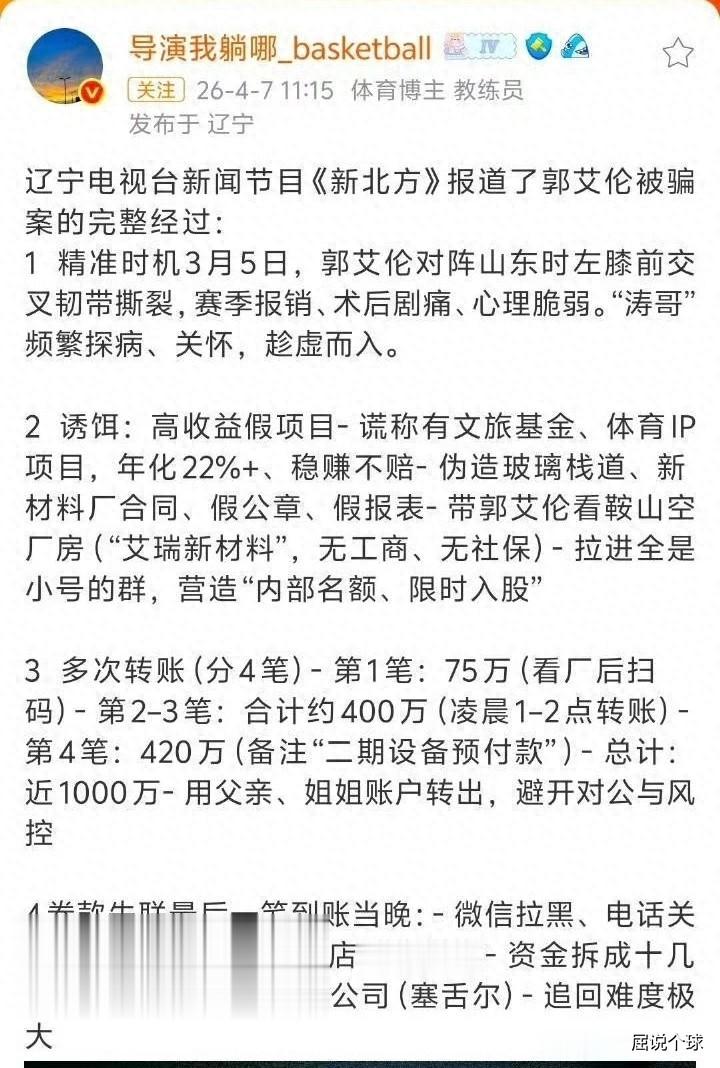 近日正在养伤的郭艾伦突然上了热搜,但是这次明显不是打篮球的事,而是很多媒体都在报道,说郭艾伦及其家人遭熟人诈骗千万,已经向公安机关报案,看到有些报道真的是说的有鼻有眼,还说是和郭艾伦从小一起打球的朋友,转账到账后就把郭艾伦的联系方式全部拉黑了。