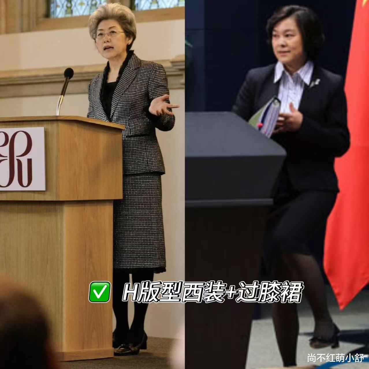 傅莹和华春莹的西装永远是正肩H型(肩线直挺不塌,腰部微收不紧身),搭配的裙长永远在膝盖下,可以很好的遮住大腿最粗处,露出小腿最细的脚踝,这些穿搭"小心机"你get到了吗?