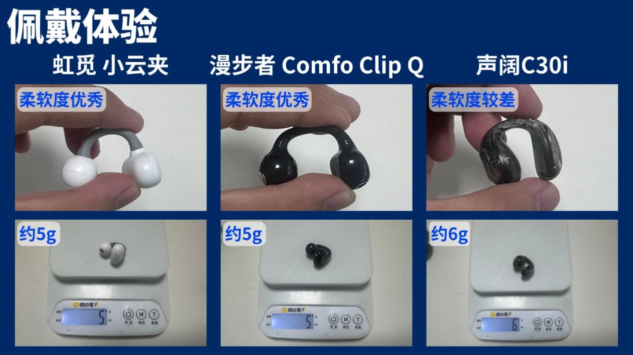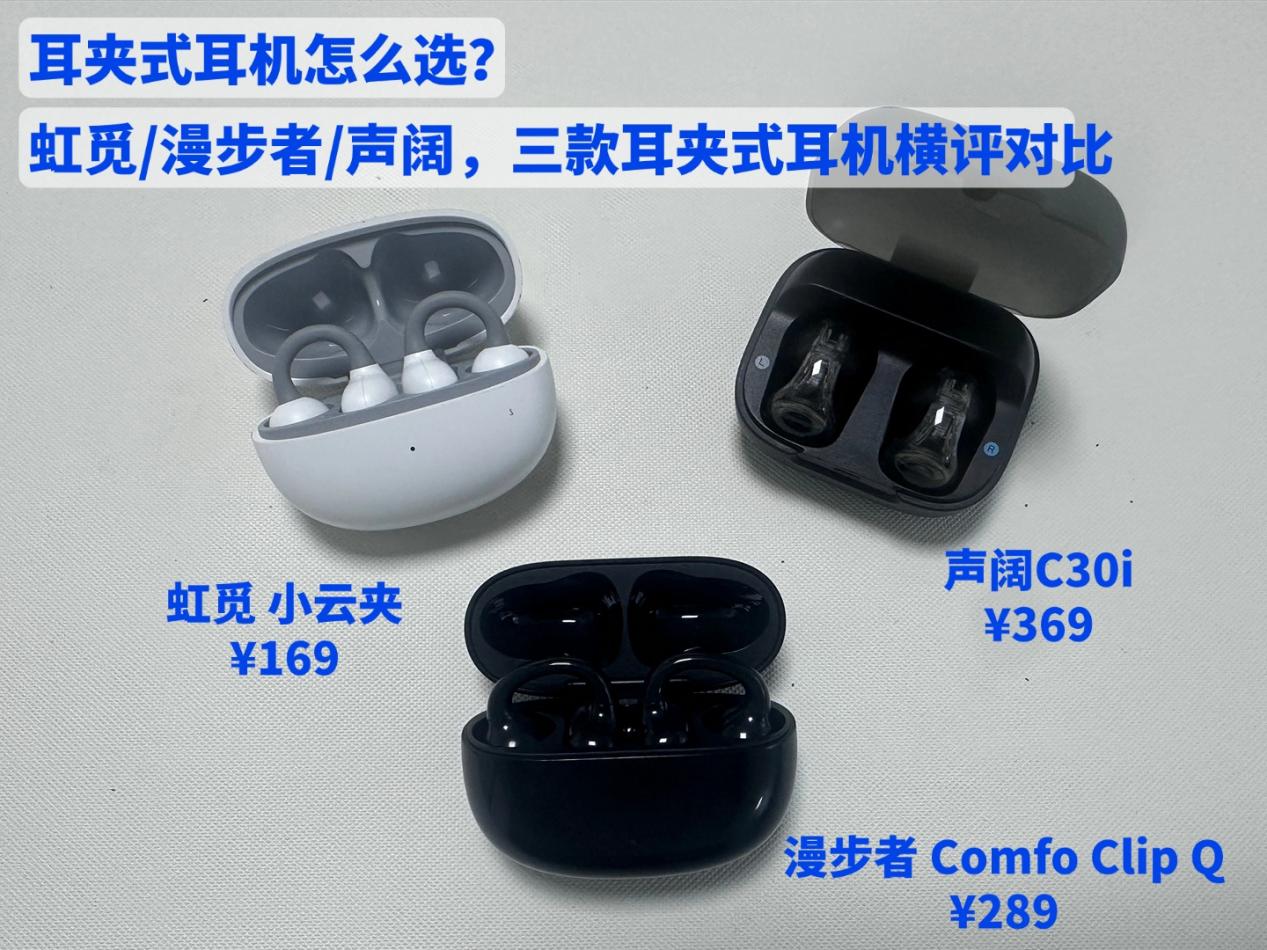 随着蓝牙耳机产品不断迭代,开放式耳机凭借“不入耳更舒适”的佩戴体验,迅速成为运动、通勤和长时间听音用户的新宠。但市场上的开放式耳机品牌众多、功能参差,究竟哪款耳机才真正好用?本文将对虹觅 小云夹,漫步者 Comfo Clip Q,声阔C30i三款热门开放式耳机进行详细对比,从佩戴舒适度、音质表现到漏音体验,为你挑出最值得入手的那一款。