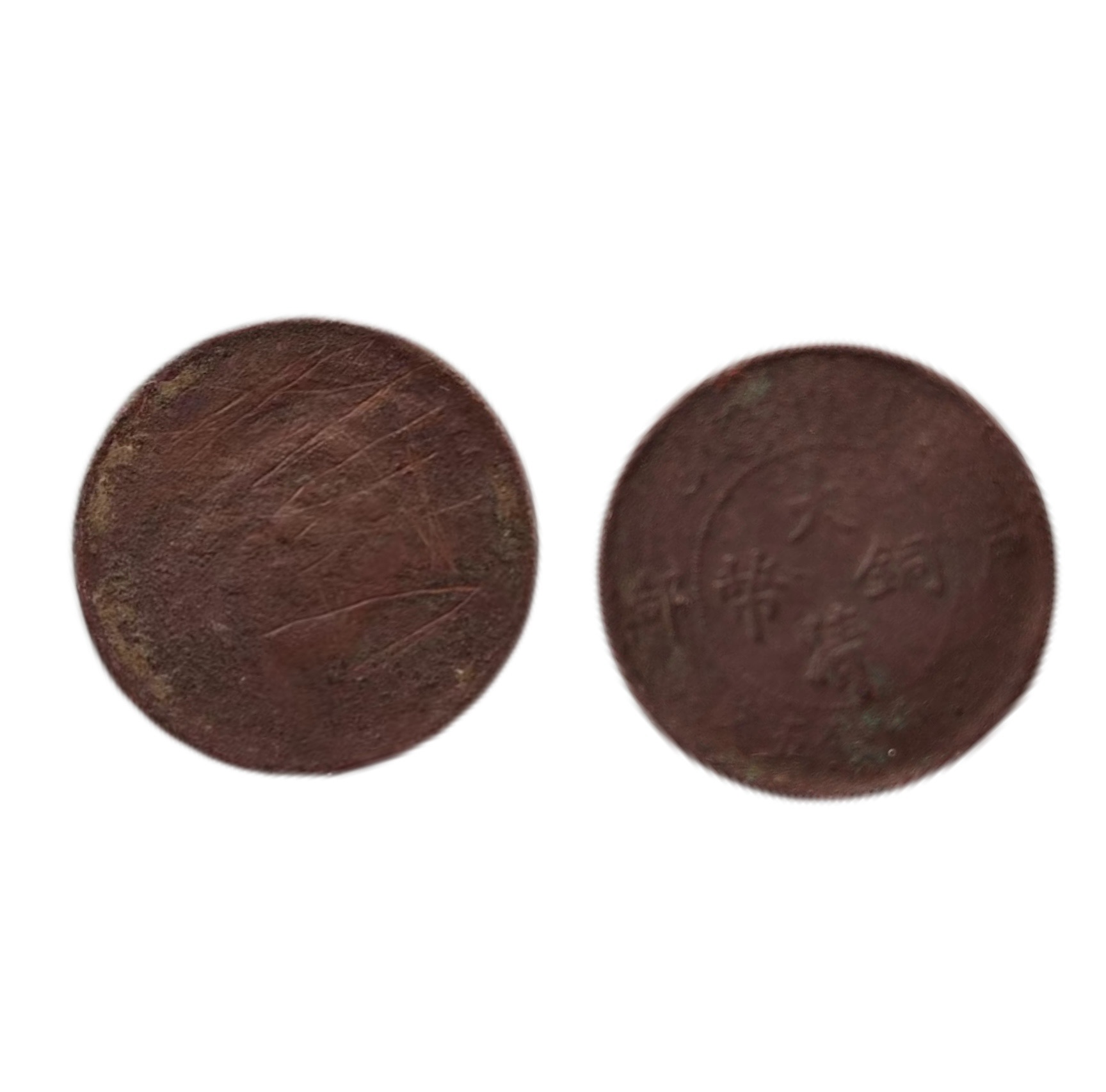 (二)文字与图案大清铜币户部的正面中央铸有 “大清铜币” 四个汉字,字体端庄规整,笔画刚劲有力,体现了当时的书法艺术水平。汉字周围环绕着一圈英文,标明了铸造机构等信息,这在一定程度上反映了晚清时期中外文化交流的背景。
