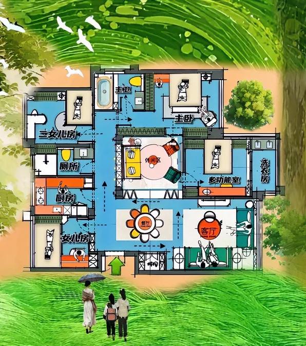 其实三大块,睡要安静,玩得靠橫厅,学习依赖烟火气三联厅,据说称为收纳大平层!