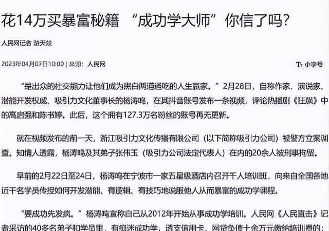 这些内容让广大网友看清了杨涛鸣的真面目,也引起了社会各界对“成功学”骗局的高度关注。