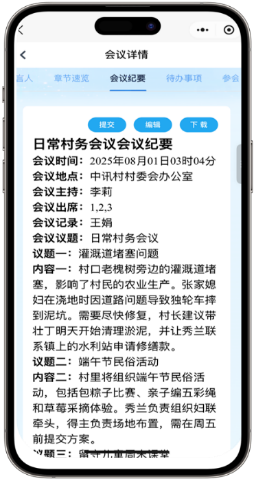 针对村务会议环境嘈杂、方言频繁、纪要难产的问题,乡研院算法团队专门进行了方言适配与降噪训练。助手支持实时录音转写与会后上传音频处理,能精准识别多位说话人并生成结构化纪要,还自动归纳待办事项,并支持自定义修改会议名称,便于后续内容识别与管理,真正做到“听得清、记得准、查得快”。