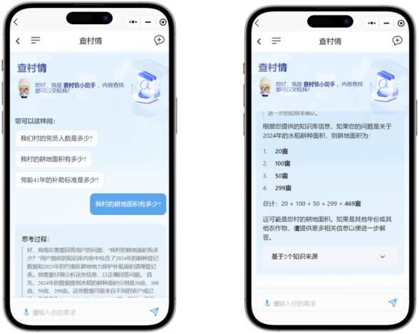 村情一查就清,数据一目了然。村务数据分散、更新不及时是基层治理中的常见痛点。“AI村委助手”通过“查村情”功能,打造出一个高效的村情信息入口。村干部只需输入关键词,即可精准查询人口结构、土地资源、产业分布、项目进度等关键数据,摆脱“翻档案、打电话、跑现场”的传统做法,为科学决策和工作统筹提供可靠支持。