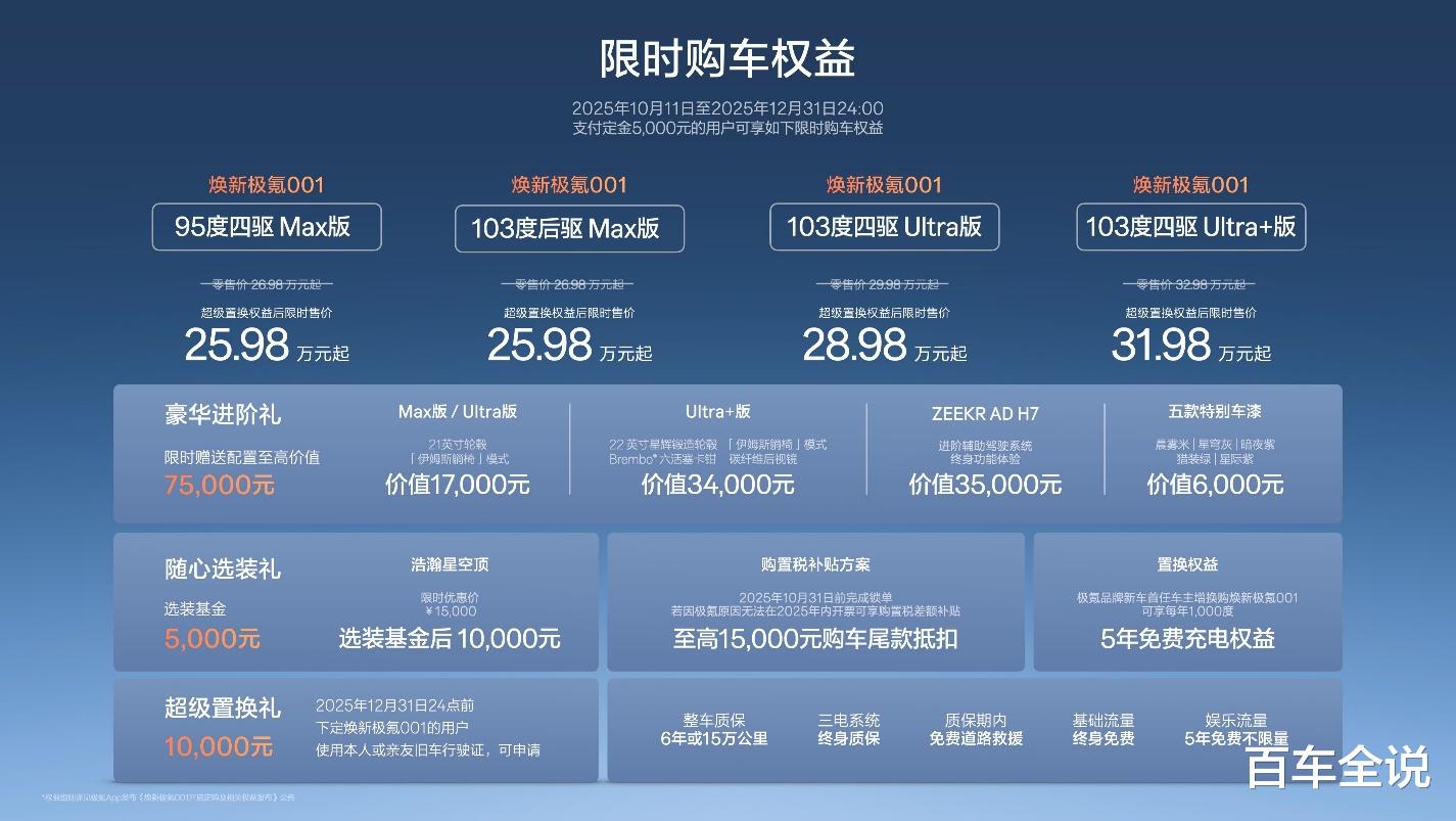 10月11日,豪华猎装轿跑焕新极氪001正式上市,官方零售价26.98万元起,超级置换权益后,限时售价为25.98万元起。即日起,用户可通过极氪App、官网、小程序及全国极氪门店等官方渠道预订。