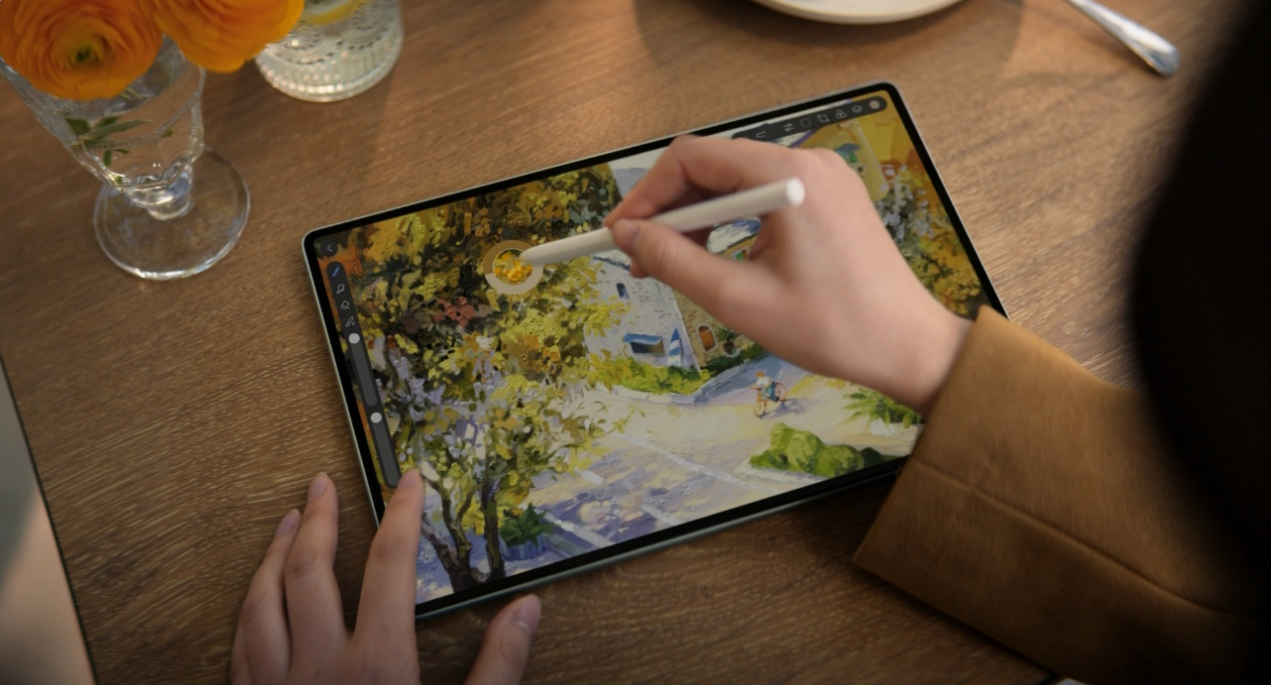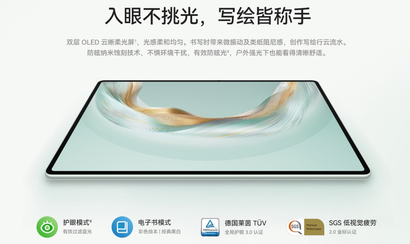 华为MatePad Pro 12.2 英寸的双层 OLED 云晰柔光屏,凭借纳米蚀刻技术,能消除屏幕99%的环境干扰光,即使是在户外强光、室内点状光源下,屏幕内容依然清晰不刺眼;同时,写画阻尼感提升47%,带来真实纸感书写体验。这块屏幕采用创新双层OLED架构配合AI Pixel光学引擎,实现2000nits峰值亮度、2,000,000:1超高对比度,色彩均匀性提升30%,无论光线如何变换,都能清晰精准呈现创作者心中的色彩。