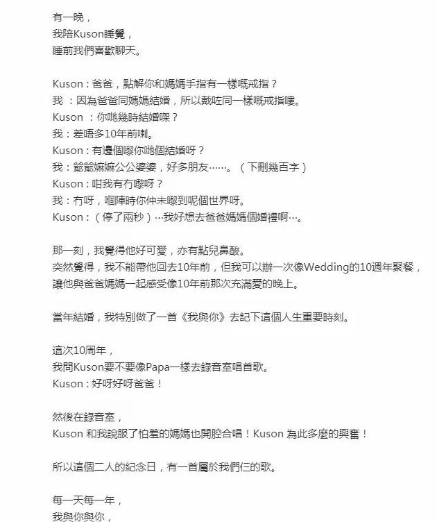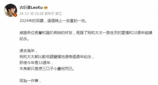 12月30日晚,歌手及演员古巨基在其个人社交媒体平台上发布了一组为纪念结婚10周年而拍摄的照片,并配文表示今年原本计划如同往昔,与妻子和儿子低调共度这一特殊日子。与儿子kuson的一次交谈后,他改变了主意,决定在结婚10周年的日子里举办一场盛大的派对。