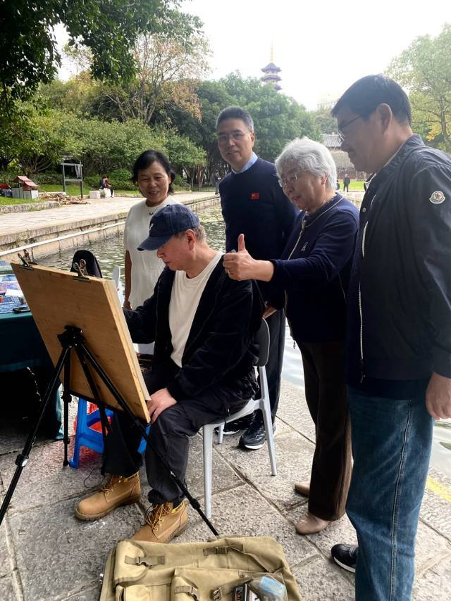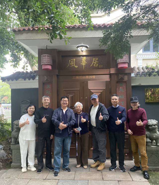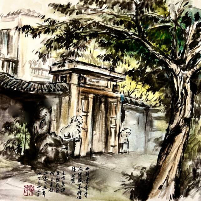 王十朋研究会主要成员右到左:曹永良、卓予拉、朱乐民、王雪丽、王金元、姜云华、黄小小。在风华居合影留念画家朱乐民先生笔墨风格:延续了他“苍劲有力、气韵生动”的特点,用浓淡交织的水墨线条勾勒建筑细节(如图中王十朋研究会会址的门庭、石狮),既保留了传统国画的写意质感,又通过厚重的笔触凸显文化场所的古朴氛围。意境表达:结合王十朋的历史文化属性,作品在“写生写实”的基础上融入了人文气息——比如画面里的老树、庭院布局,既还原了场所风貌,也传递出与王十朋相关的历史沉淀感。题材适配性:作为研究会文艺委员,他的作品会更注重“文化符号的提炼”,作为视觉重点,让作品既具备艺术表现力,也贴合学术团体的文化传播需求。一、题材与文化内核的结合他的作品会精准提炼文化符号,让画面自带“文化场所”的辨识度,而非单纯的风景写生。以王十朋为例,作品会通过庭院的静谧感、笔墨的厚重感,暗合王十朋“刚正、文儒”的历史形象。二、笔墨技法的表现力 线条:用“苍劲写意线+细致工笔线”结合的方式——建筑结构用相对规整的线条勾勒(保证辨识度),而植物、背景用泼墨/散锋笔触(增加国画的气韵)。墨色:浓淡层次丰富,比如建筑主体用中墨凸显质感,背景的树木、墙面用淡墨晕染,既区分空间层次,也营造出古朴、沉静的氛围。三、意境的传递不追求“完全写实”,而是通过场景氛围的营造传递文化感:比如画面里的光影、留白,会弱化“写生的真实感”,强化“历史场所的沉淀感”。作品的“叙事性”弱、“氛围感”强:重点让观者通过画面感受到文化场所的气质。