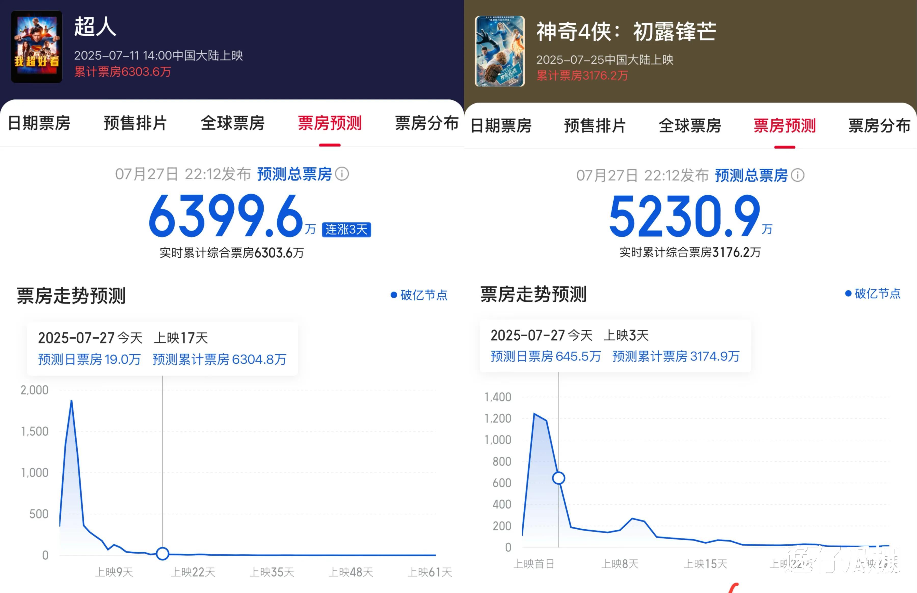 可是,这并不代表进口大片的春天来了,7月份,两部曾经风靡国内的超级英雄电影满怀信心的勇闯国内院线,其中《超人》在上映前更是一副熹妃回宫的霸气!然而,现实是残酷的,《超人》和《神奇4侠:初露锋芒》两部片子在国内基本都是一日游,在院线经理给了足够的排片情况下,首映日票房倒挂的惨不忍睹,直接被市场淘汰!目前两部电影的预测票房落点都在7000万以下。