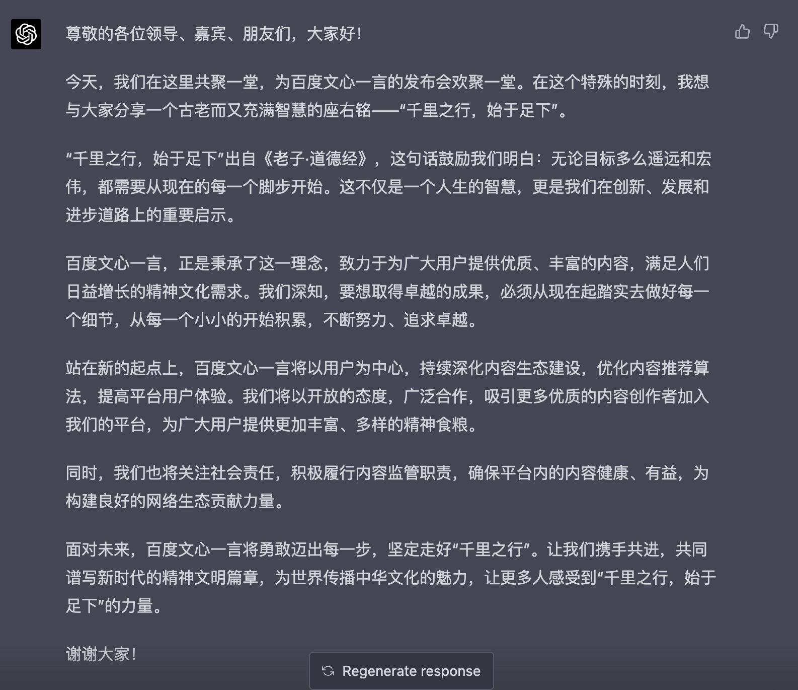 最后,笔者对文心一言和ChatGPT(GPT-4)提出了“以‘千里之行始于足下’为主题,为百度文心一言发布会创作一篇发言稿”的要求。