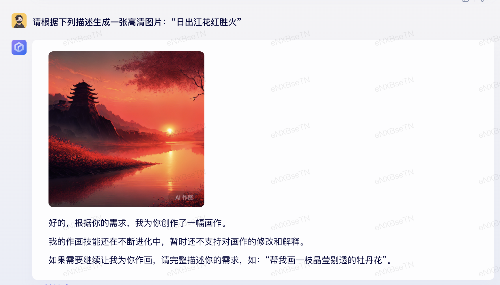 从图像生成能力来看,对一些易于理解的,诗句本身对画面有丰富描述的诗句,文心一言可以呈现出比较好的效果。以“日出江花红胜火”为例,文心一言给出的画面准确囊括了日出、江水、花、红等画面元素,甚至还在江边生成了一座塔,颇有江南风味。