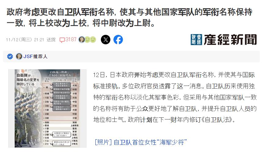 当地时间12日,多位日本政府消息人士对外透露,日本政府正在积极考虑更改自卫队的军衔名称,美其名曰:“为了与国际标准接轨,方便开展军事交流与合作”。只不过,考虑到日本近年来的种种举动,这种说法显然不足以令人信服。