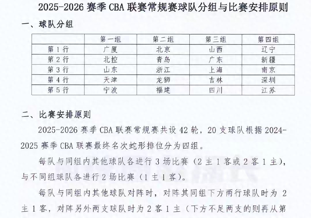 根据规则CBA20支球队,被分成了四组每组五支球队。而各支球队的排列顺序,是按照上赛季各队的成绩排名依次排列的。