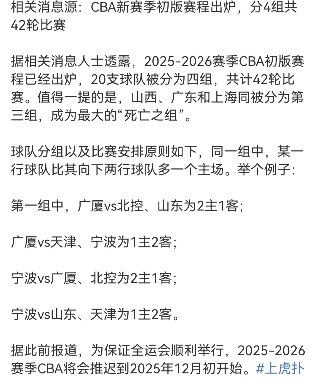 根据多方媒体的消息,CBA2025—2026赛季的球队分组情况已经在近期出炉,目前仅差官宣。然而根据曝出的分组情况来看,各支球队的所在小组的实力也是各有不同。上赛季的冠亚军广厦和北京两队以及辽宁,这三支队伍同组对手相对实力一般形势向好。而作为曾经的11冠王,广东宏远则是被分到了死亡之组。