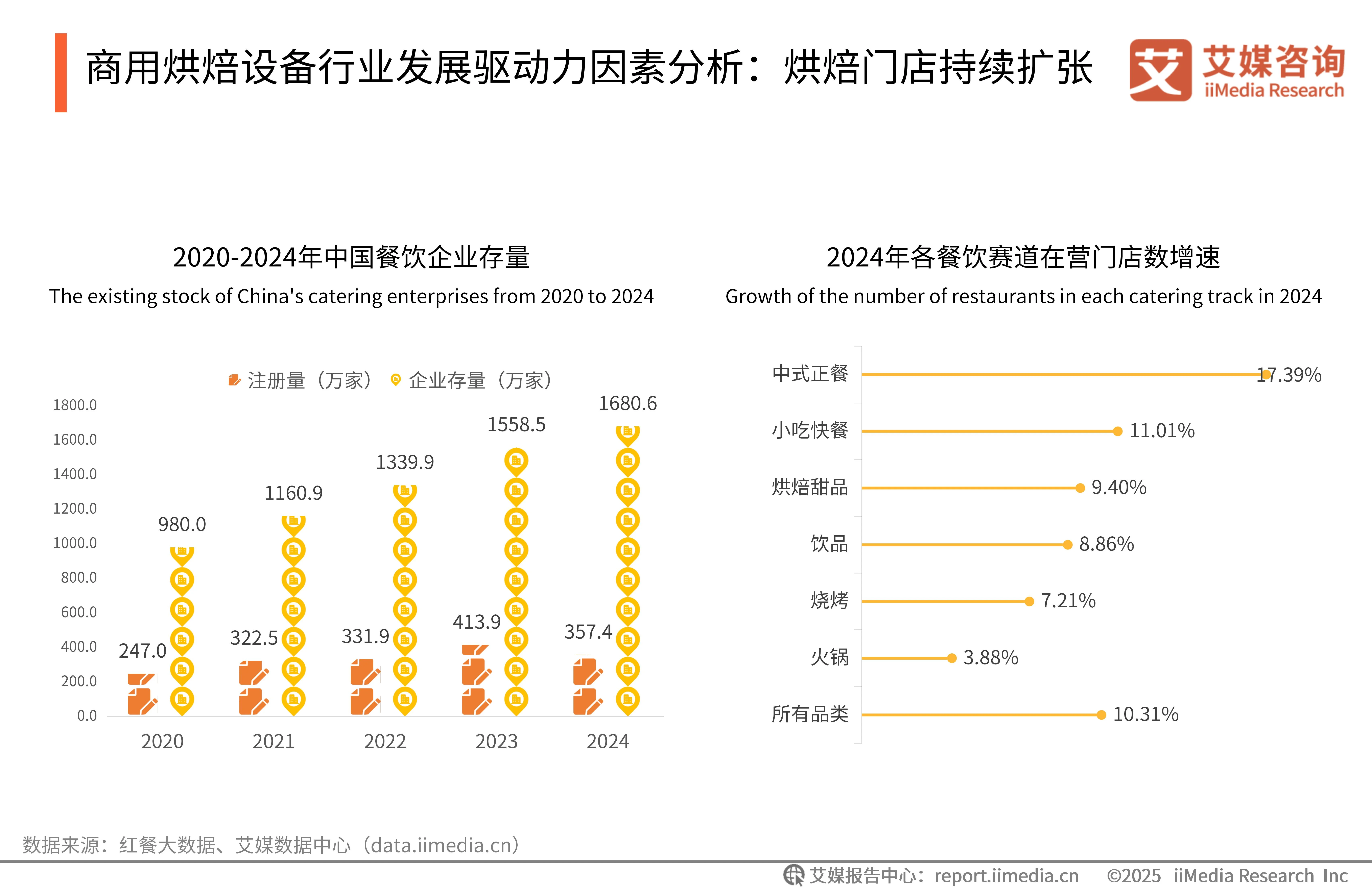 数据显示,2020-2024年全国餐饮企业存量从980.0万家增长至1680.6万家,整体规模接近翻番。2024年,烘焙甜品以9.40%的门店增速稳居餐饮品类第一梯队,高于饮品、火锅等品类,但略低于小吃快餐及中式正餐。艾媒咨询分析师认为,随着餐饮企业数量激增及烘焙门店的高速扩张,设备需求持续向自动化、高效能升级。烘焙品类的高增长与餐饮连锁化趋势,也将促使设备向定制化、多功能集成方向迭代。