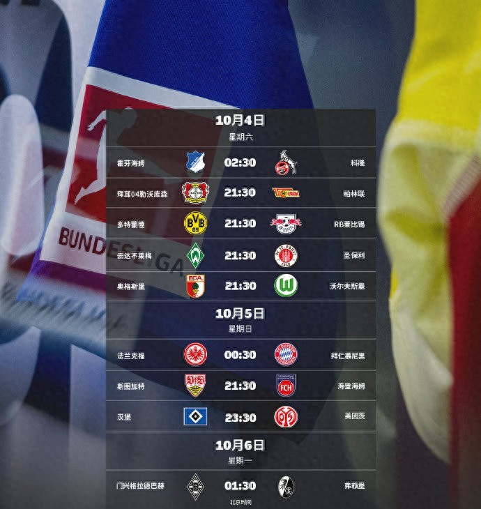 北京时间10月4日02:30至10月6日01:30,2025-2026赛季的德甲联赛第6轮的较量将在本周末正式开打。在本轮联赛中,拜仁将在客场对阵德甲攻击力排名第二的法兰克福,而多特则将是在主场迎战莱比锡,汉堡则是主场对阵美因茨。