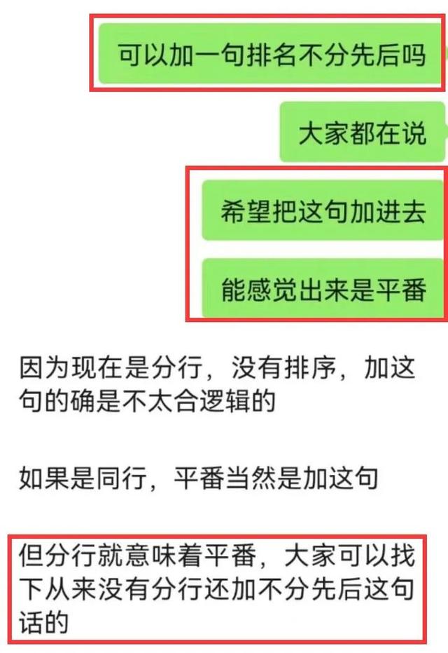 粉丝甚至跟鼻姐公司的人据理力争,希望公司可以去交涉官博,官宣文案里加一行字“排名不分先后”,但公司认为官博分行就已经是平番的意思,是你们自己看不懂而已。