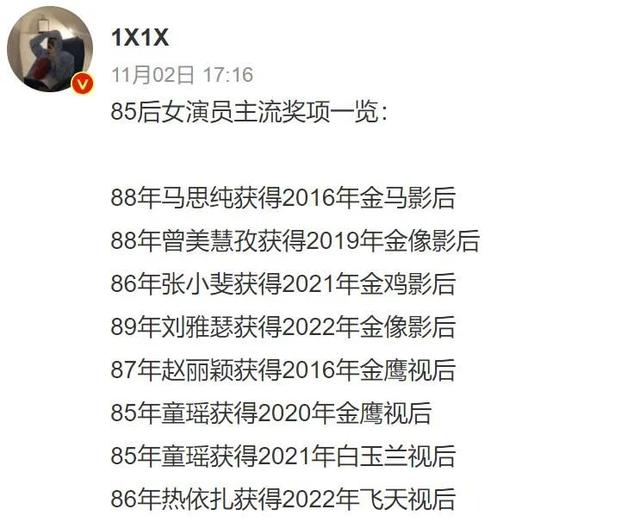 自打前天86年生人的热依扎拿下飞天视后之后,大家在讨论这一波85后女演员曾经拿下的主流奖项。