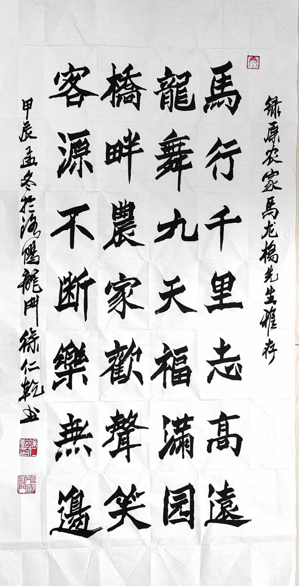 徐仁乾先生艺术简历:徐仁乾先生1956年8月出生,号万安居士,男,汉族,大学文化、中国河南洛阳市人,著名书法家。现为中国书画家协会理事,河南省书法家协会会员,中国书法艺术研究院艺委会委员,中国民族建筑研究会书画艺术专业委员会理事兼客座教授,中国工业合作协会,国家智库专家委员会书画艺术“专家”,中国楹联协会书画专业委员会特邀书法家,中国企业报道艺术资本理事会副主席,全国首届“一带一路”文化使者,洛阳市洛龙区书法家协会顾问,洛阳龙门书法家协会主席,中国皖洛书画院名誉院长,洛阳江苏商会特聘艺术名家。幼承庭训,习书染翰,痴于书画,少年研习洛阳(民国时期)林东郊、高福堂、李振九、曹明为等名家书法作品,遍临历代各家碑帖,后尤喜“二王”书体,特别是近二十余载,由于工作生活在龙门石窟附近,对龙门二十品产生浓厚兴趣,对其重点研习,学书五十余载挥毫不辍,遍访名家,虚心向学,切磋交流,成果颇丰,至今已卓然大家,自成一体,深受书界欢迎。其书画作品曾多次参加全国及省市大展,并多次获金奖银奖,其书法隶书《观海听涛》被人民大会堂收藏,多幅作品入选《中国书法家作品选集》《中国书画宝典》《中国艺术家》等典籍。2005年6月被中国书画家联谊会ISQ9000A艺术体系资质认证。评审委员会授予“中国优秀书法师称号”。2010年其题赠上海世博全国艺术家题贺活动组委会收藏。2014年其书法作品参加中华民族艺术交流评选活动,被授予“金奖艺术家”荣誉称号。