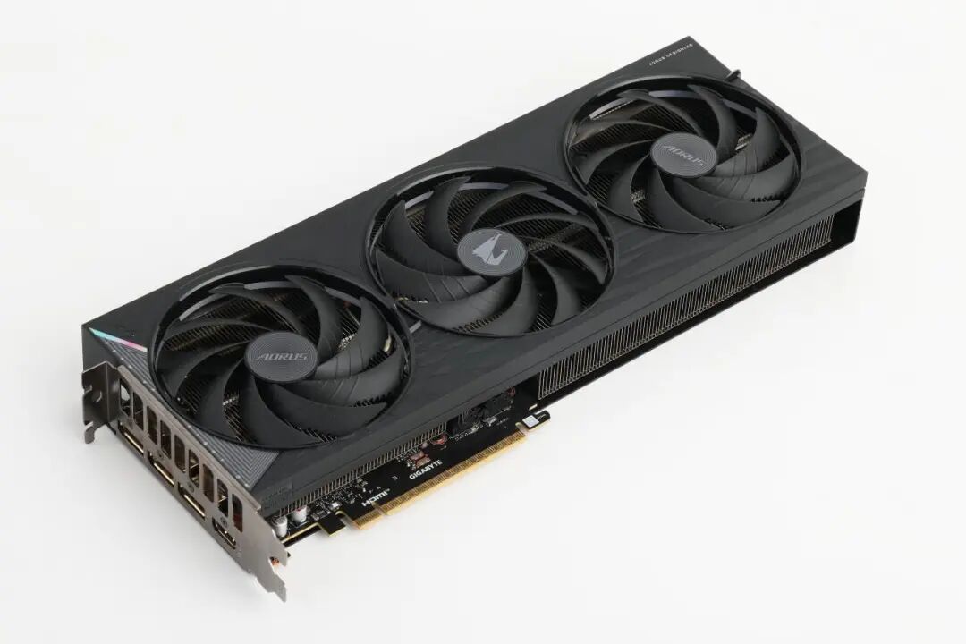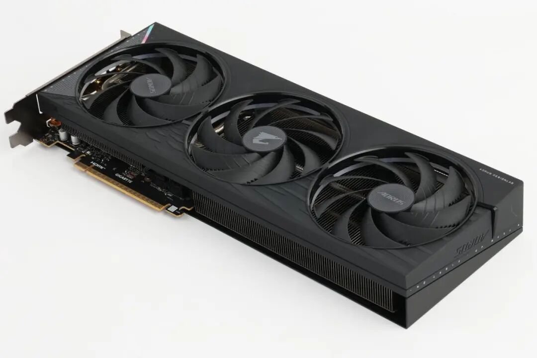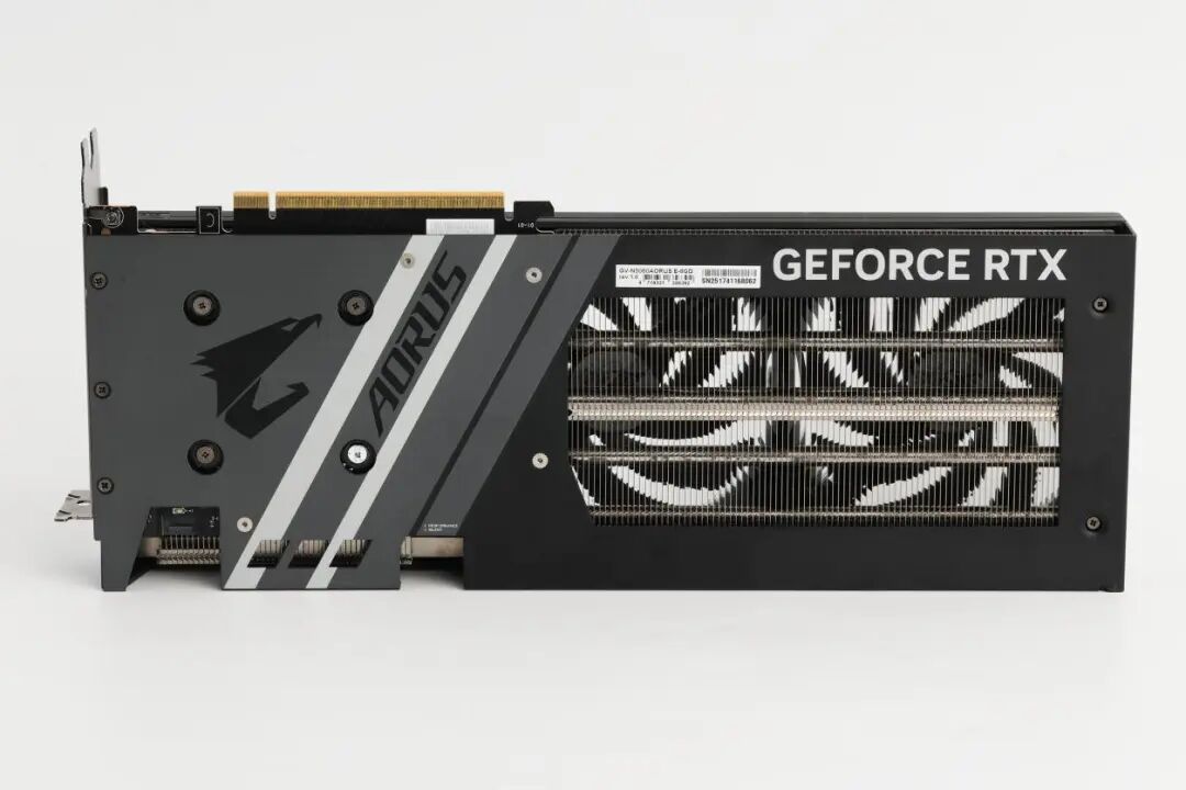 将显卡翻转查看其背部,AORUS GeForce RTX 5060 ELITE 8G采用的金属背板同样可圈可点,兼具美学价值与实用功能。背板左侧以AORUS标志性的雕头元素作为核心装饰,搭配两条利落的白色线条进行区域分割,使视觉重心清晰明确,巧妙营造出层次分明、错落有致的设计感,与正面风格形成呼应又各具特色。