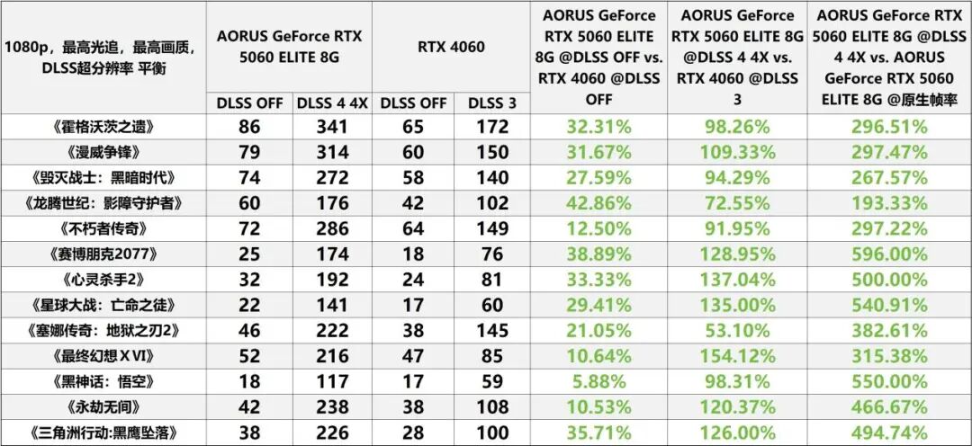 通过与前代产品RTX 4060的直接性能对决,DLSS 4技术的优势展现得淋漓尽致。在关闭DLSS功能的纯硬件性能比拼中,技嘉AORUS GeForce RTX 5060 ELITE 8G已能实现约30%的帧率领先,这一数据直观印证了其在核心硬件规格上的先天优势。而当DLSS 4被激活后,性能差距进一步呈现质的飞跃——相较于仅支持DLSS 3的RTX 4060,该显卡在测试覆盖的多数游戏中,帧率提升幅度竟突破110%,部分高负载场景的优势更是令人瞩目,充分彰显了新一代AI渲染技术的革命性突破。