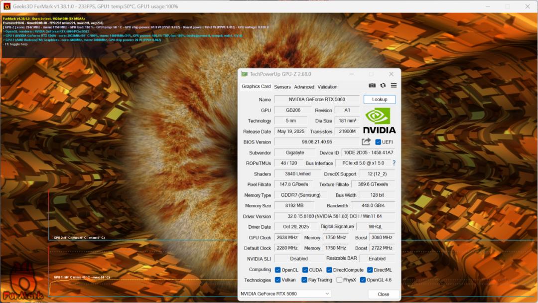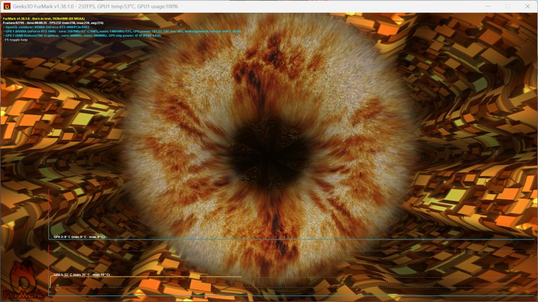 为更好地验证技嘉AORUS GeForce RTX 5060 ELITE 8G的稳定性,我们首先通过Furmark软件执行高负载烤机任务,在室温稳定23℃的环境下,将显卡设置为1080p分辨率并关闭抗锯齿功能——最终实测数据显示,显卡核心温度稳定在53℃左右,如此优异的散热表现堪称亮眼夺目,直观印证了新一代风之力散热系统的硬核实力。值得注意的是,该显卡的核心Boost频率已预超频至2722MHz,较NVIDIA官方指导频率更高,在核心性能潜力提升的同时,仍能实现低温控制,更凸显其散热架构的过人之处。