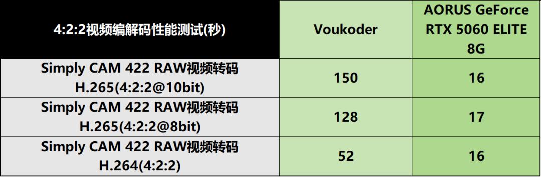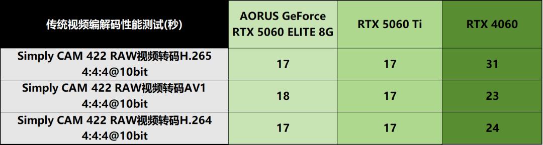 在视频转码测试方面,技嘉AORUS GeForce RTX 5060 ELITE 8G的效率优势同样锋芒毕露。在统一编码参数的测试环境下,该显卡完成视频转码任务的耗时较RTX 4060显著缩短,尤其在处理4K/8K高分辨率或120fps高帧率素材时,其硬件编码的高效特性得以充分释放,有效缓解了后期制作中的效率瓶颈。更为重要的是,该显卡支持4:2:2专业色度采样格式,这一特性使其在广播电视、专业影像制作等特定工作流中实现了“质的飞跃”,较传统软件解码方式大幅缩短耗时,为专业创作者提供了更高效的工作路径。