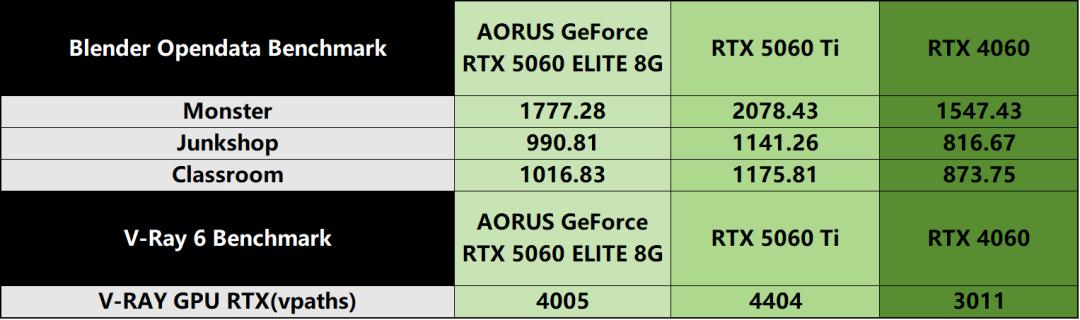 生产力与AIGC性能测试除游戏场景外,技嘉AORUS GeForce RTX 5060 ELITE 8G在专业创作领域的性能表现同样值得关注。我们首先选取Blender Opendata Benchmark与V-RAY GPU RTX,针对显卡的图形渲染与计算性能展开测试,以量化其在创意工作流中的实用价值。